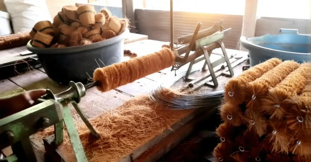 After collecting the separated fibers, they are cut to the required size using sharp-bladed equipment. The hand-twisted fibers are then shaped and assembled to form various coconut fiber products.